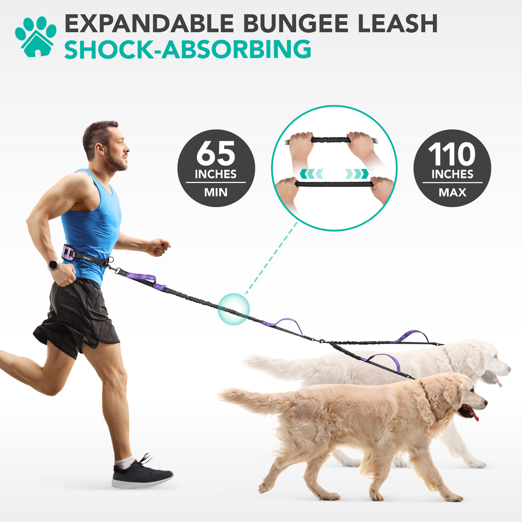 - Measures: Leash supports weight up to 75 lbs per leash. Bungee cord stretch to 110 inches max. Waist belt stretch up to 42 inches