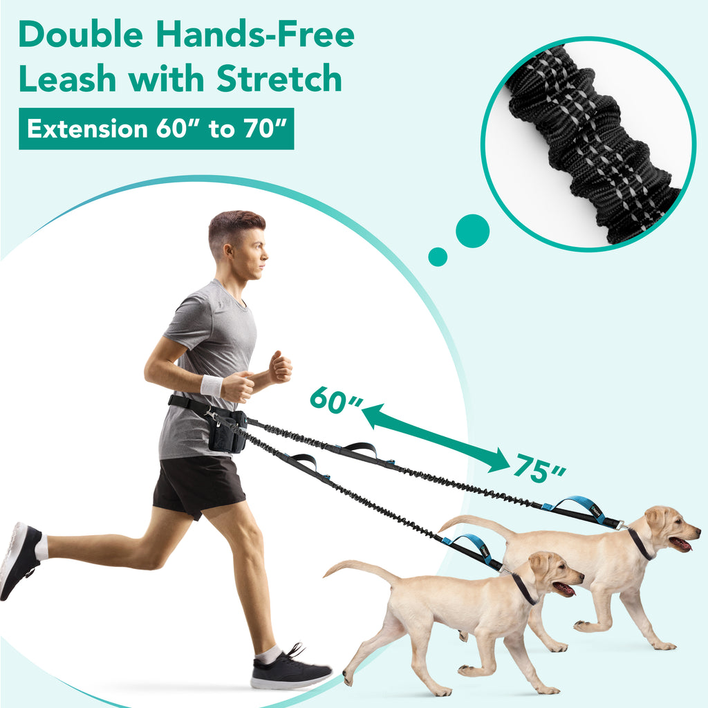 - Measures: Leash supports weight up to 150 lbs. Bungee cord stretch to 75 inches max. Waist belt stretch from 28 inches to 52 inches